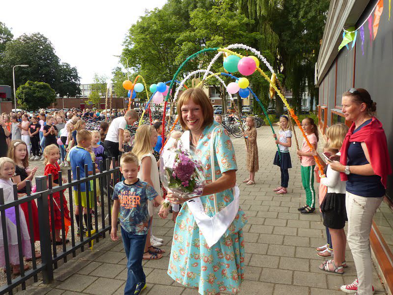 Een grootschalige receptie zat er niet in, maar collega’s hadden iets anders op touw gezet: samen met haar man maakte ze een fietstocht door het dorp en op verschillende punten stonden kinderen en ouders die haar iets cadeau gaven en een deel van een lied zongen. Langs de kreek stonden veel voormalig collega’s en oud-leerlingen om haar uit te zwaaien en iets toe te wensen. Bij terugkomst op school was er een lunch en gezellig samenzijn met collega’s en naaste familie en werd ze namens CSG De Waard bedankt voor al die jaren collega zijn en ook lid van de GMR.