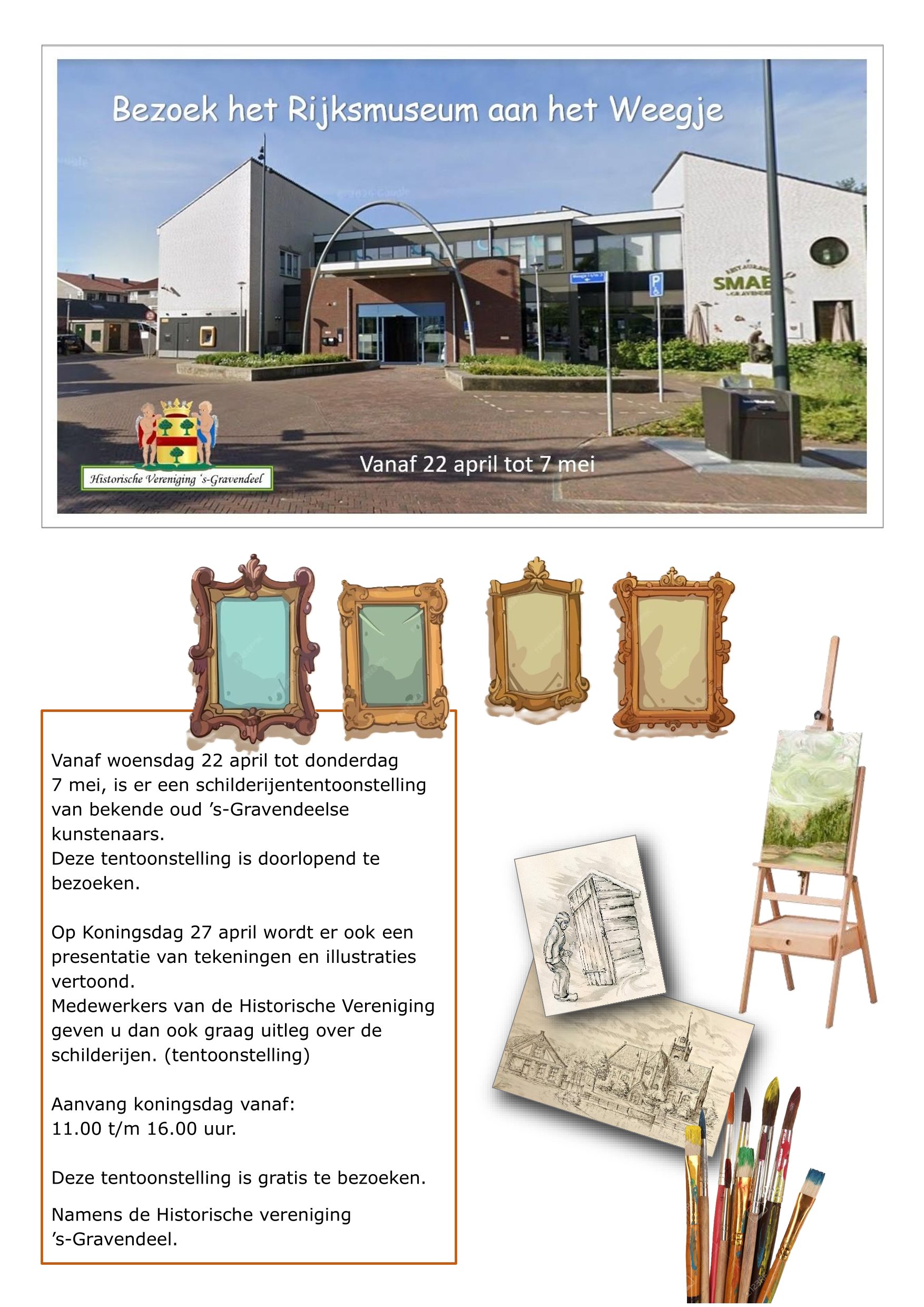 Op Koningsdag, zaterdag 27 april, is er een speciale presentatie van tekeningen en illustraties. Medewerkers van de Historische Vereniging zijn die dag aanwezig om uitleg te geven over de schilderijen en de achtergrond van de werken. De presentatie is te bezoeken van 11.00 tot 16.00 uur.