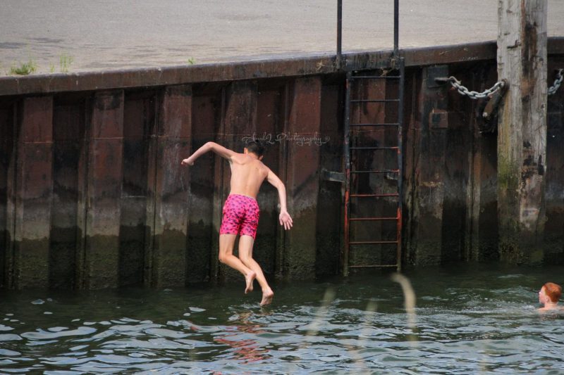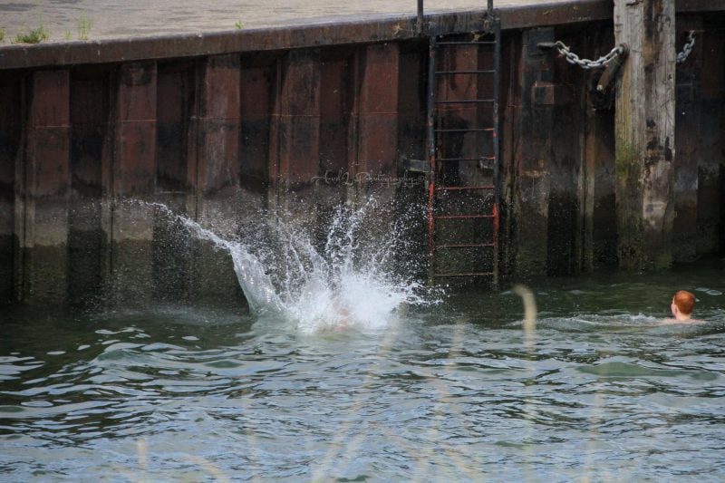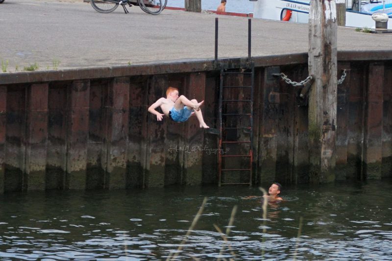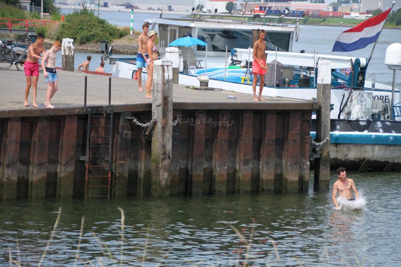 De meeste gaan naar de stranden langs de kust en anderen zoeken verkoeling in de wateren in de buurt zoals o.a. hier in het haventje van ‘s-Gravendeel want andere plekken in de Hoeksche Waard was het druk op strandjes en zwembaden zoals het Recreatieoord Binnenmaas.