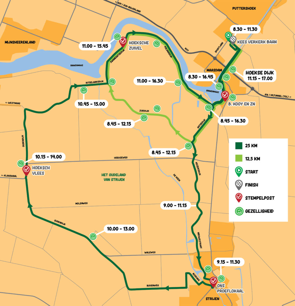 De 25 kilometer route start op zaterdag 14 september om half negen vanuit Puttershoek, een uur later vertrekken de deelnemers aan de 12,5 kilometer. Om zoveel mogelijk mensen te stimuleren en motiveren om te sporten en bewegen, start in samenwerking met provincie Zuid-Holland om half 12 het onderdeel: “Wandel Feest voor Iedereen”. Mensen waarvoor sporten en bewegen niet vanzelfsprekend is, leggen een compact parcours af. Dit mag door hen in eigen tempo worden afgelegd: wandelend, met behulp van een rolstoel of andere hulpmiddelen.