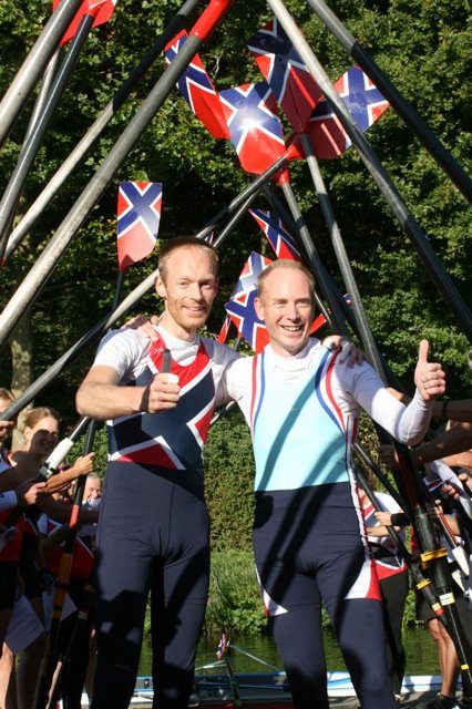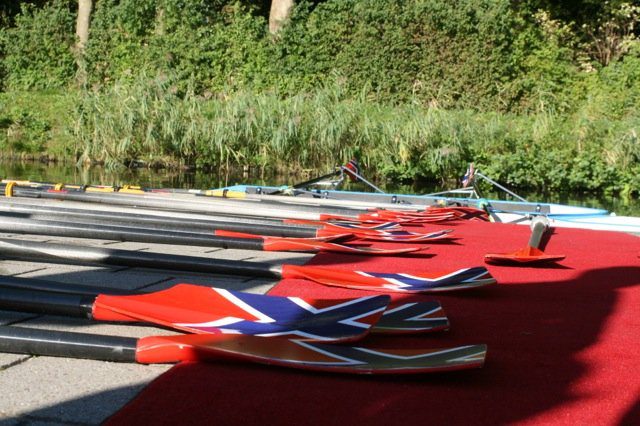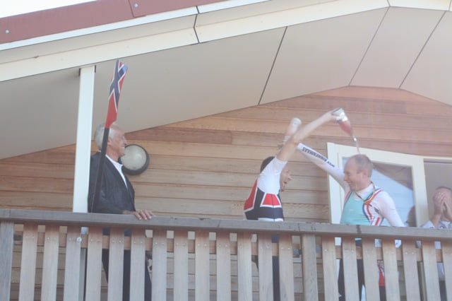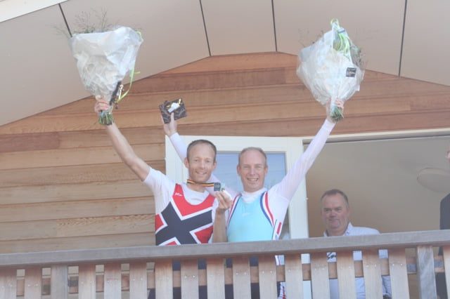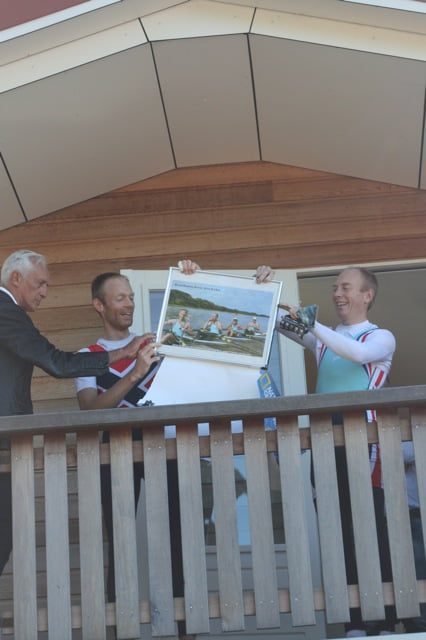 Eenmaal op het balkon werden Sam en Harald gefeliciteerd door de voorzitter van de roeiafdeling en konden zij een uitvergrootte foto van het gouden team in ontvangst nemen.